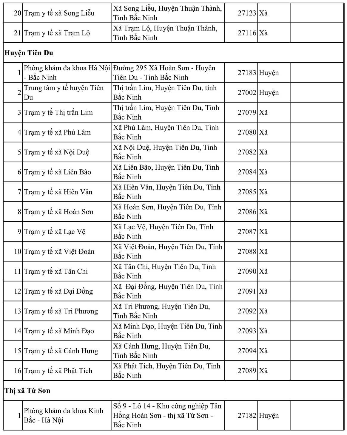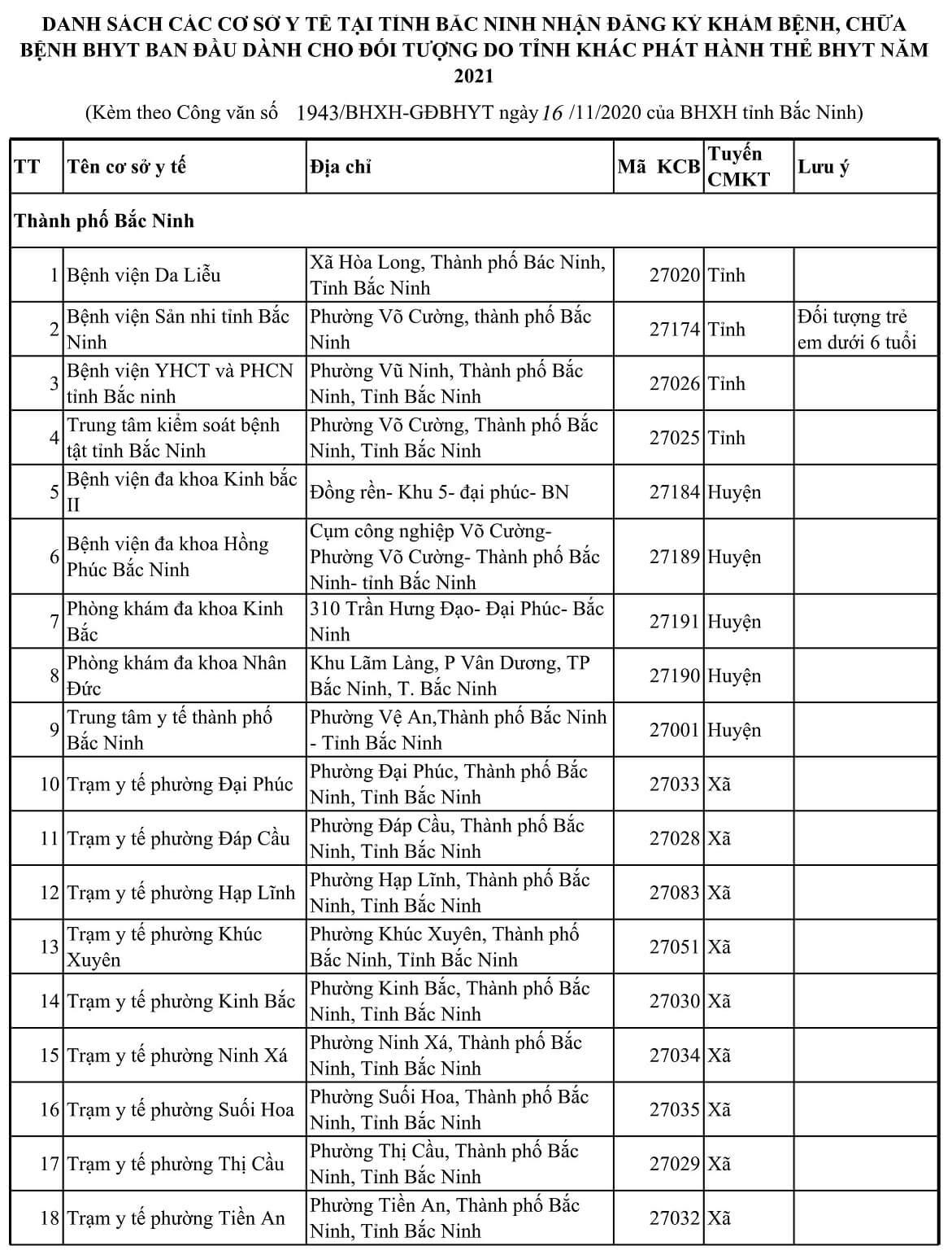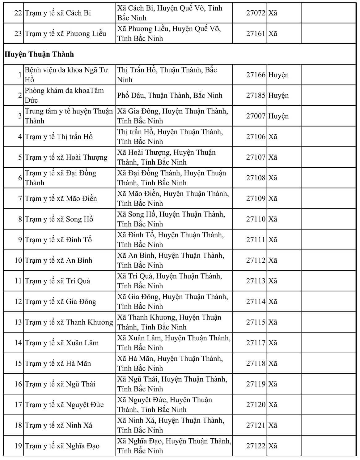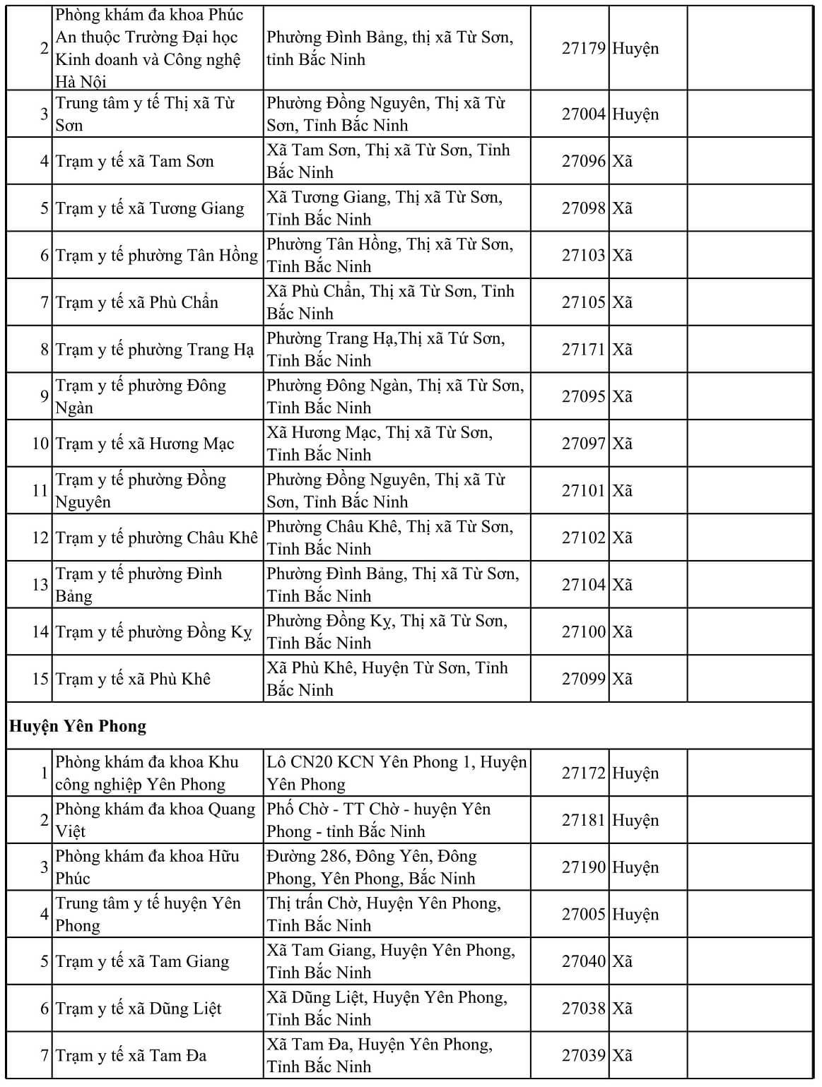 TT Tên cơ sở y tế Địa chỉ Mã KCB Tuyến CMKT Lưu ý Thành phố Bắc Ninh 1 Bệnh viện Da Liễu Xã Hòa Long, Thành phố Bác Ninh, Tỉnh Bắc Ninh 27020 Tỉnh 2 Bệnh viện Sản nhi tỉnh Bắc Ninh Phường Võ Cường, thành phố Bắc Ninh 27174 Tỉnh Đối tượng trẻ em dưới 6 tuổi 3 Bệnh viện YHCT và PHCN tỉnh Bắc ninh Phường Vũ Ninh, Thành phố Bắc Ninh, Tỉnh Bắc Ninh 27026 Tỉnh 4 Trung tâm kiểm soát bệnh tật tỉnh Bắc Ninh Phường Võ Cường, Thành phố Bắc Ninh, Tỉnh Bắc Ninh 27025 Tỉnh 5 Bệnh viện đa khoa Kinh bắc II Đồng rền- Khu 5- đại phúc- BN 27184 Huyện 6 Bệnh viện đa khoa Hồng Phúc Bắc Ninh Cụm công nghiệp Võ CườngPhường Võ Cường- Thành phố Bắc Ninh- tỉnh Bắc Ninh 27189 Huyện 7 Phòng khám đa khoa Kinh Bắc 310 Trần Hưng Đạo- Đại Phúc- Bắc Ninh 27191 Huyện 8 Phòng khám đa khoa Nhân Đức Khu Lãm Làng, P Vân Dương, TP Bắc Ninh, T. Bắc Ninh 27190 Huyện 9 Trung tâm y tế thành phố Bắc Ninh Phường Vệ An,Thành phố Bắc Ninh - Tỉnh Bắc Ninh 27001 Huyện 10 Trạm y tế phường Đại Phúc Phường Đại Phúc, Thành phố Bắc Ninh, Tỉnh Bắc Ninh 27033 Xã 11 Trạm y tế phường Đáp Cầu Phường Đáp Cầu, Thành phố Bắc Ninh, Tỉnh Bắc Ninh 27028 Xã 12 Trạm y tế phường Hạp Lĩnh Phường Hạp Lĩnh, Thành phố Bắc Ninh, Tỉnh Bắc Ninh 27083 Xã 13 Trạm y tế phường Khúc Xuyên Phường Khúc Xuyên, Thành phố Bắc Ninh, Tỉnh Bắc Ninh 27051 Xã 14 Trạm y tế phường Kinh Bắc Phường Kinh Bắc, Thành phố Bắc Ninh, Tỉnh Bắc Ninh 27030 Xã 15 Trạm y tế phường Ninh Xá Phường Ninh Xá, Thành phố Bắc Ninh, Tỉnh Bắc Ninh 27034 Xã 16 Trạm y tế phường Suối Hoa Phường Suối Hoa, Thành phố Bắc Ninh, Tỉnh Bắc Ninh 27035 Xã 17 Trạm y tế phường Thị Cầu Phường Thị Cầu, Thành phố Bắc Ninh, Tỉnh Bắc Ninh 27029 Xã 18 Trạm y tế phường Tiền An Phường Tiền An, Thành phố Bắc Ninh, Tỉnh Bắc Ninh 27032 Xã 19 Trạm y tế phường Vạn An Phường Vạn An, Thành phố Bắc Ninh, Tỉnh Bắc Ninh 27048 Xã 20 Trạm y tế phường Vệ An Phường Vệ An, Thành phố Bắc Ninh, Tỉnh Bắc Ninh 27031 Xã 21 Trạm y tế phường Võ Cường Phường Võ Cường, Thành phố Bắc Ninh, Tỉnh Bắc Ninh 27036 Xã 22 Trạm y tế phường Vũ Ninh Phường Vũ Ninh, Thành phố Bắc Ninh, Tỉnh Bắc Ninh 27027 Xã 23 Trạm y tế xã Hòa Long Phường Hòa Long, Thành phố Bác Ninh, Tỉnh Bắc Ninh 27044 Xã 24 Trạm y tế xã Khắc Niệm Phường Khắc Niệm, Thành phố Bắc Ninh, Tỉnh Bắc Ninh 27081 Xã 25 Trạm y tế xã Kim Chân Phường Kim Chân, Thành phố Bắc Ninh, Tỉnh Bắc Ninh 27058 Xã 26 Trạm y tế xã Nam Sơn Phường Nam Sơn, Thành phố Bắc Ninh, Tỉnh Bắc Ninh 27068 Xã 27 Trạm y tế xã Phong Khê Phường Phong Khê, Thành phố Bắc Ninh, Tỉnh Bắc Ninh 27054 Xã 28 Trạm y tế xã Vân Dương Phường Vân Dương, TP Bắc Ninh, Bắc Ninh 27063 Xã Huyện Gia Bình 1 Phòng Khám Đa Khoa Thuận An Thôn Cầu Đào - Nhân Thắng - H Gia Bình - T Bắc Ninh 27188 Huyện 2 Trung tâm y tế huyện Gia Bình Thị trấn Gia Bình, Huyện Gia Bình, Tỉnh Bắc Ninh 27006 Huyện 3 Trạm y tế Thị trấn Gia Bình Thị trấn Gia Bình, Huyện Gia Bình, Tỉnh Bắc Ninh 27124 Xã 4 Trạm y tế xã Vạn Ninh Xã Vạn Ninh, Huyện Gia Bình, Tỉnh Bắc Ninh 27125 Xã 5 Trạm y tế xã Thái Bảo Xã Thái Bảo, Huyện Gia Bình, Tỉnh Bắc Ninh 27126 Xã 6 Trạm y tế xã Cao Đức Xã Cao Đức, Huyện Gia Bình, Tỉnh Bắc Ninh 27128 Xã 7 Trạm y tế xã Đại Lai Xã Đại Lai, Huyện Gia Bình, Tỉnh Bắc Ninh 27129 Xã 8 Trạm y tế xã Song Giang Xã Song Giang, Huyện Gia Bình, Tỉnh Bắc Ninh 27130 Xã 9 Trạm y tế xã Bình Dương Xã Bình Dương, Huyện Gia Bình, Tỉnh Bắc Ninh 27131 Xã 10 Trạm y tế xã Lãng Ngâm Xã Lãng Ngâm, Huyện Gia Bình, Tỉnh Bắc Ninh 27132 Xã 11 Trạm y tế xã Nhân Thắng Xã Nhân Thắng, Huyện Gia Bình, Tỉnh Bắc Ninh 27133 Xã 12 Trạm y tế xã Xuân Lai Xã Xuân Lai, Huyện Gia Bình, Tỉnh Bắc Ninh 27134 Xã 13 Trạm y tế xã Đông Cứu Xã Đông Cứu, Huyện Gia Bình, Tỉnh Bắc Ninh 27135 Xã 14 Trạm y tế xã Đại Bái Xã Đại Bái, Huyện Gia Bình, Tỉnh Bắc Ninh 27136 Xã 15 Trạm y tế xã Giang Sơn Xã Giang Sơn, Huyện Gia Bình, Tỉnh Bắc Ninh 27127 Xã 16 Trạm y tế xã Quỳnh Phú Xã Quỳnh Phú, Huyện Gia Bình, Tỉnh Bắc Ninh 27137 Xã Huyện Lương Tài 1 Phòng khám đa khoa Vượng Đức Ngọc Thượng – Phú Hòa Lương Tàitỉnh Bắc Ninh 27192 Huyện 2 Trung tâm y tế huyện Lương Tài Huyện Lương Tài, Tỉnh Bắc Ninh 27003 Huyện 3 Trạm y tế Thị trấn Thứa Thị trấn Thứa, Huyện Lương Tài, Tỉnh Bắc Ninh 27138 Xã 4 Trạm y tế xã An Thịnh Xã An Thịnh, Huyện Lương Tài, Tỉnh Bắc Ninh 27139 Xã 5 Trạm y tế Xã Trung Kênh Xã Trung Kênh, Huyện Lương Tài, Tỉnh Bắc Ninh 27140 Xã 6 Trạm y tế xã Phú Hòa Xã Phú Hòa, Huyện Lương Tài, Tỉnh Bắc Ninh 27141 Xã 7 Trạm y tế xã Mỹ Hương Xã Mỹ Hương, Huyện Lương Tài, Tỉnh Bắc Ninh 27142 Xã 8 Trạm y tế xã Tân Lãng Xã Tân Lãng, Huyện Lương Tài, Tỉnh Bắc Ninh 27143 Xã 9 Trạm y tế xã Quảng Phú Xã Quảng Phú, Huyện Lương Tài, Tỉnh Bắc Ninh 27144 Xã 10 Trạm y tế xã Trừng Xá Xã Trừng Xá, Huyện Lương Tài, Tỉnh Bắc Ninh 27145 Xã 11 Trạm y tế xã Lai Hạ Xã Lai Hạ, Huyện Lương Tài, Tỉnh Bắc Ninh 27146 Xã