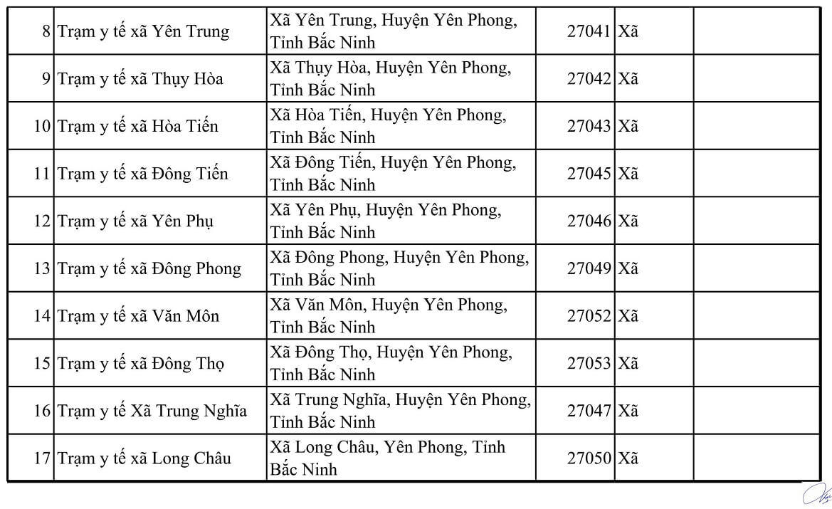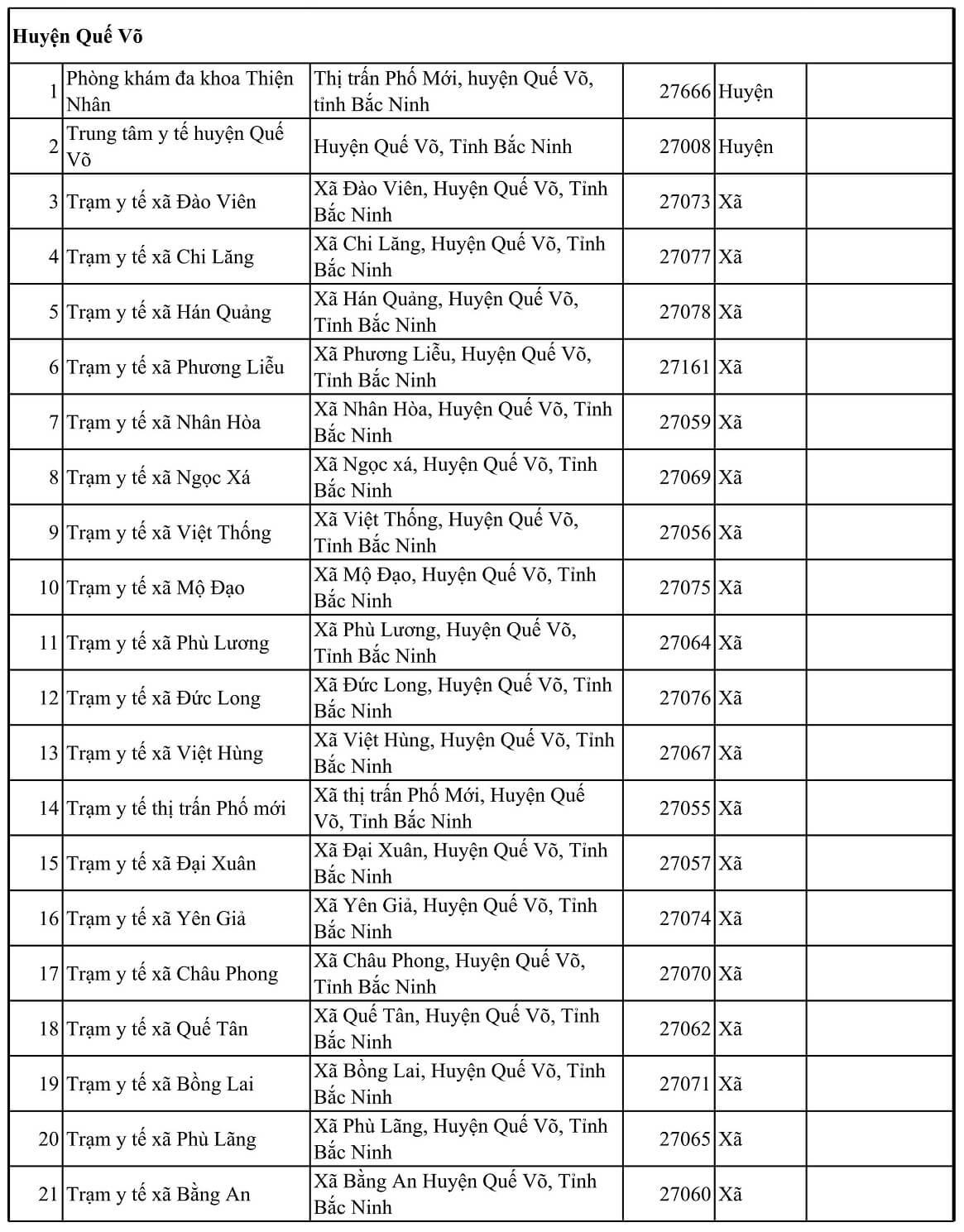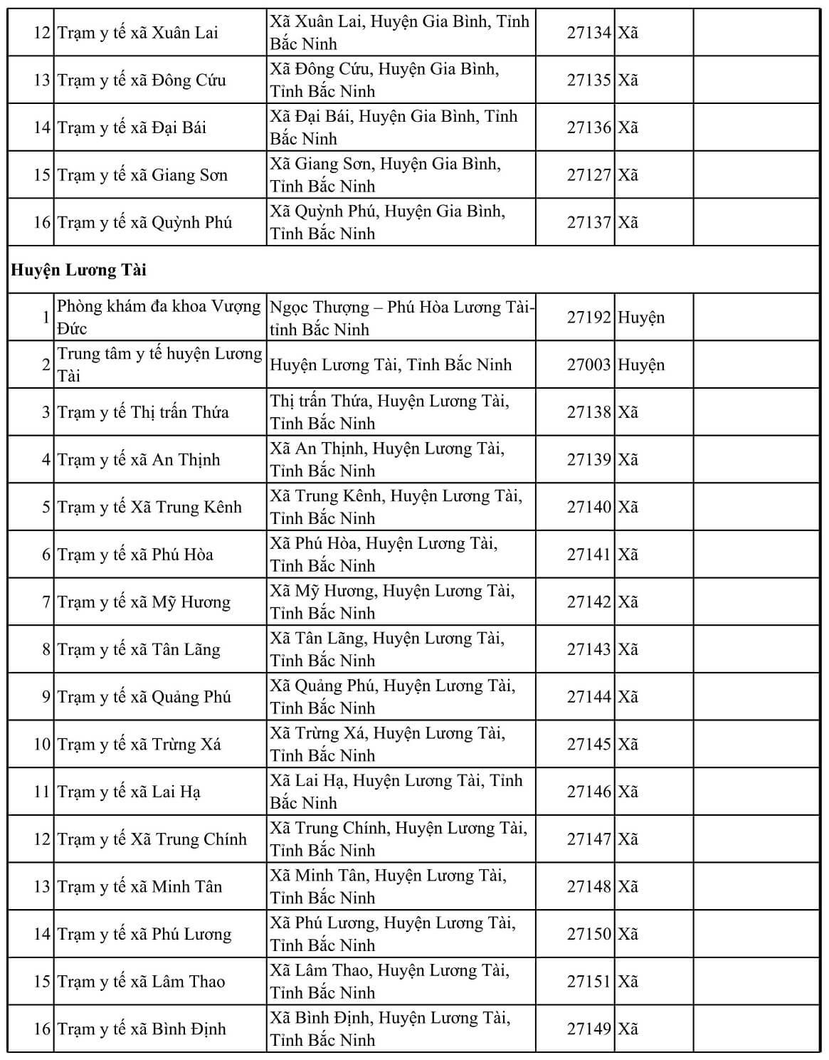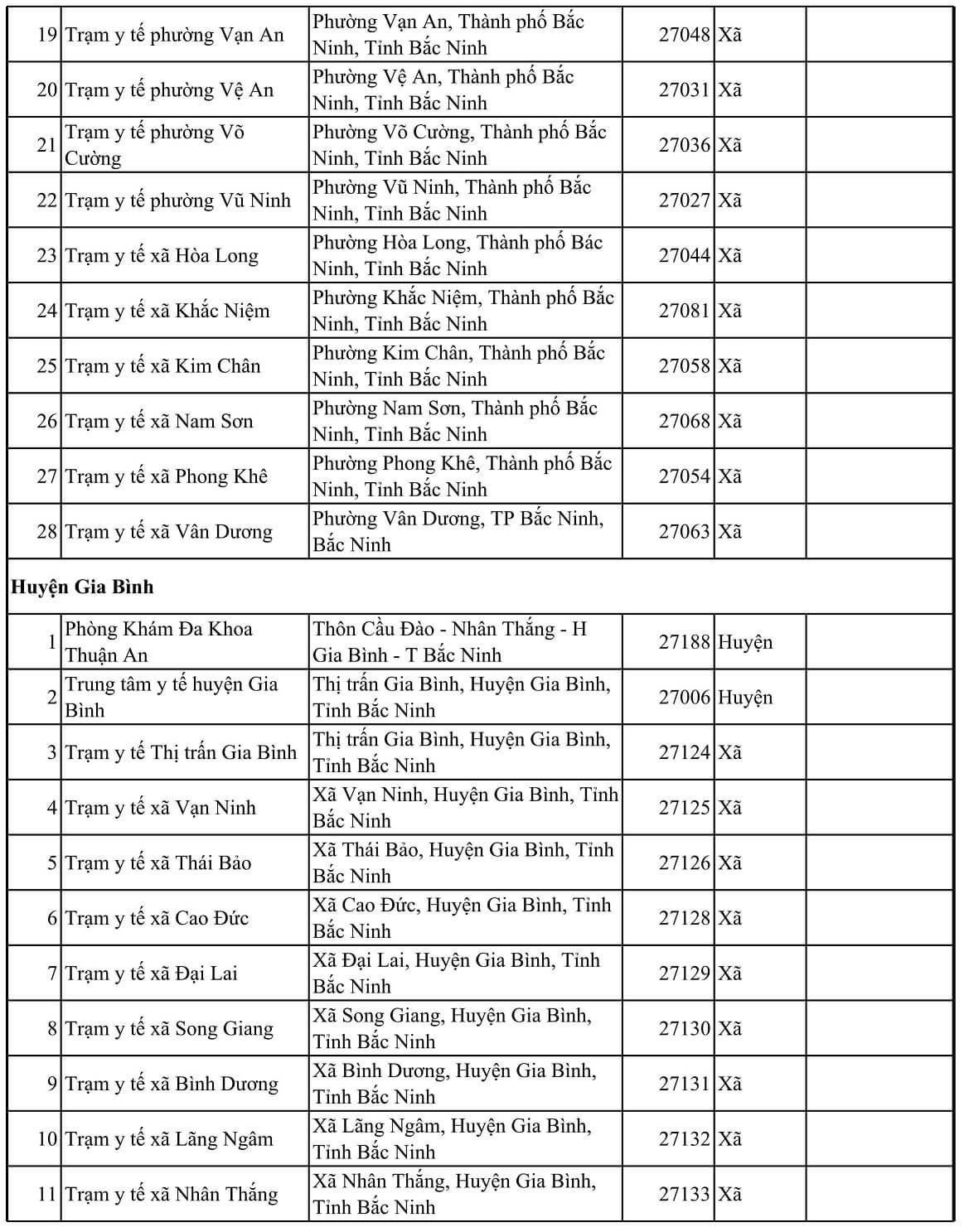 TT Tên cơ sở y tế Địa chỉ Mã KCB Tuyến CMKT Lưu ý Thành phố Bắc Ninh 1 Bệnh viện Da Liễu Xã Hòa Long, Thành phố Bác Ninh, Tỉnh Bắc Ninh 27020 Tỉnh 2 Bệnh viện Sản nhi tỉnh Bắc Ninh Phường Võ Cường, thành phố Bắc Ninh 27174 Tỉnh Đối tượng trẻ em dưới 6 tuổi 3 Bệnh viện YHCT và PHCN tỉnh Bắc ninh Phường Vũ Ninh, Thành phố Bắc Ninh, Tỉnh Bắc Ninh 27026 Tỉnh 4 Trung tâm kiểm soát bệnh tật tỉnh Bắc Ninh Phường Võ Cường, Thành phố Bắc Ninh, Tỉnh Bắc Ninh 27025 Tỉnh 5 Bệnh viện đa khoa Kinh bắc II Đồng rền- Khu 5- đại phúc- BN 27184 Huyện 6 Bệnh viện đa khoa Hồng Phúc Bắc Ninh Cụm công nghiệp Võ CườngPhường Võ Cường- Thành phố Bắc Ninh- tỉnh Bắc Ninh 27189 Huyện 7 Phòng khám đa khoa Kinh Bắc 310 Trần Hưng Đạo- Đại Phúc- Bắc Ninh 27191 Huyện 8 Phòng khám đa khoa Nhân Đức Khu Lãm Làng, P Vân Dương, TP Bắc Ninh, T. Bắc Ninh 27190 Huyện 9 Trung tâm y tế thành phố Bắc Ninh Phường Vệ An,Thành phố Bắc Ninh - Tỉnh Bắc Ninh 27001 Huyện 10 Trạm y tế phường Đại Phúc Phường Đại Phúc, Thành phố Bắc Ninh, Tỉnh Bắc Ninh 27033 Xã 11 Trạm y tế phường Đáp Cầu Phường Đáp Cầu, Thành phố Bắc Ninh, Tỉnh Bắc Ninh 27028 Xã 12 Trạm y tế phường Hạp Lĩnh Phường Hạp Lĩnh, Thành phố Bắc Ninh, Tỉnh Bắc Ninh 27083 Xã 13 Trạm y tế phường Khúc Xuyên Phường Khúc Xuyên, Thành phố Bắc Ninh, Tỉnh Bắc Ninh 27051 Xã 14 Trạm y tế phường Kinh Bắc Phường Kinh Bắc, Thành phố Bắc Ninh, Tỉnh Bắc Ninh 27030 Xã 15 Trạm y tế phường Ninh Xá Phường Ninh Xá, Thành phố Bắc Ninh, Tỉnh Bắc Ninh 27034 Xã 16 Trạm y tế phường Suối Hoa Phường Suối Hoa, Thành phố Bắc Ninh, Tỉnh Bắc Ninh 27035 Xã 17 Trạm y tế phường Thị Cầu Phường Thị Cầu, Thành phố Bắc Ninh, Tỉnh Bắc Ninh 27029 Xã 18 Trạm y tế phường Tiền An Phường Tiền An, Thành phố Bắc Ninh, Tỉnh Bắc Ninh 27032 Xã 19 Trạm y tế phường Vạn An Phường Vạn An, Thành phố Bắc Ninh, Tỉnh Bắc Ninh 27048 Xã 20 Trạm y tế phường Vệ An Phường Vệ An, Thành phố Bắc Ninh, Tỉnh Bắc Ninh 27031 Xã 21 Trạm y tế phường Võ Cường Phường Võ Cường, Thành phố Bắc Ninh, Tỉnh Bắc Ninh 27036 Xã 22 Trạm y tế phường Vũ Ninh Phường Vũ Ninh, Thành phố Bắc Ninh, Tỉnh Bắc Ninh 27027 Xã 23 Trạm y tế xã Hòa Long Phường Hòa Long, Thành phố Bác Ninh, Tỉnh Bắc Ninh 27044 Xã 24 Trạm y tế xã Khắc Niệm Phường Khắc Niệm, Thành phố Bắc Ninh, Tỉnh Bắc Ninh 27081 Xã 25 Trạm y tế xã Kim Chân Phường Kim Chân, Thành phố Bắc Ninh, Tỉnh Bắc Ninh 27058 Xã 26 Trạm y tế xã Nam Sơn Phường Nam Sơn, Thành phố Bắc Ninh, Tỉnh Bắc Ninh 27068 Xã 27 Trạm y tế xã Phong Khê Phường Phong Khê, Thành phố Bắc Ninh, Tỉnh Bắc Ninh 27054 Xã 28 Trạm y tế xã Vân Dương Phường Vân Dương, TP Bắc Ninh, Bắc Ninh 27063 Xã Huyện Gia Bình 1 Phòng Khám Đa Khoa Thuận An Thôn Cầu Đào - Nhân Thắng - H Gia Bình - T Bắc Ninh 27188 Huyện 2 Trung tâm y tế huyện Gia Bình Thị trấn Gia Bình, Huyện Gia Bình, Tỉnh Bắc Ninh 27006 Huyện 3 Trạm y tế Thị trấn Gia Bình Thị trấn Gia Bình, Huyện Gia Bình, Tỉnh Bắc Ninh 27124 Xã 4 Trạm y tế xã Vạn Ninh Xã Vạn Ninh, Huyện Gia Bình, Tỉnh Bắc Ninh 27125 Xã 5 Trạm y tế xã Thái Bảo Xã Thái Bảo, Huyện Gia Bình, Tỉnh Bắc Ninh 27126 Xã 6 Trạm y tế xã Cao Đức Xã Cao Đức, Huyện Gia Bình, Tỉnh Bắc Ninh 27128 Xã 7 Trạm y tế xã Đại Lai Xã Đại Lai, Huyện Gia Bình, Tỉnh Bắc Ninh 27129 Xã 8 Trạm y tế xã Song Giang Xã Song Giang, Huyện Gia Bình, Tỉnh Bắc Ninh 27130 Xã 9 Trạm y tế xã Bình Dương Xã Bình Dương, Huyện Gia Bình, Tỉnh Bắc Ninh 27131 Xã 10 Trạm y tế xã Lãng Ngâm Xã Lãng Ngâm, Huyện Gia Bình, Tỉnh Bắc Ninh 27132 Xã 11 Trạm y tế xã Nhân Thắng Xã Nhân Thắng, Huyện Gia Bình, Tỉnh Bắc Ninh 27133 Xã 12 Trạm y tế xã Xuân Lai Xã Xuân Lai, Huyện Gia Bình, Tỉnh Bắc Ninh 27134 Xã 13 Trạm y tế xã Đông Cứu Xã Đông Cứu, Huyện Gia Bình, Tỉnh Bắc Ninh 27135 Xã 14 Trạm y tế xã Đại Bái Xã Đại Bái, Huyện Gia Bình, Tỉnh Bắc Ninh 27136 Xã 15 Trạm y tế xã Giang Sơn Xã Giang Sơn, Huyện Gia Bình, Tỉnh Bắc Ninh 27127 Xã 16 Trạm y tế xã Quỳnh Phú Xã Quỳnh Phú, Huyện Gia Bình, Tỉnh Bắc Ninh 27137 Xã Huyện Lương Tài 1 Phòng khám đa khoa Vượng Đức Ngọc Thượng – Phú Hòa Lương Tàitỉnh Bắc Ninh 27192 Huyện 2 Trung tâm y tế huyện Lương Tài Huyện Lương Tài, Tỉnh Bắc Ninh 27003 Huyện 3 Trạm y tế Thị trấn Thứa Thị trấn Thứa, Huyện Lương Tài, Tỉnh Bắc Ninh 27138 Xã 4 Trạm y tế xã An Thịnh Xã An Thịnh, Huyện Lương Tài, Tỉnh Bắc Ninh 27139 Xã 5 Trạm y tế Xã Trung Kênh Xã Trung Kênh, Huyện Lương Tài, Tỉnh Bắc Ninh 27140 Xã 6 Trạm y tế xã Phú Hòa Xã Phú Hòa, Huyện Lương Tài, Tỉnh Bắc Ninh 27141 Xã 7 Trạm y tế xã Mỹ Hương Xã Mỹ Hương, Huyện Lương Tài, Tỉnh Bắc Ninh 27142 Xã 8 Trạm y tế xã Tân Lãng Xã Tân Lãng, Huyện Lương Tài, Tỉnh Bắc Ninh 27143 Xã 9 Trạm y tế xã Quảng Phú Xã Quảng Phú, Huyện Lương Tài, Tỉnh Bắc Ninh 27144 Xã 10 Trạm y tế xã Trừng Xá Xã Trừng Xá, Huyện Lương Tài, Tỉnh Bắc Ninh 27145 Xã 11 Trạm y tế xã Lai Hạ Xã Lai Hạ, Huyện Lương Tài, Tỉnh Bắc Ninh 27146 Xã