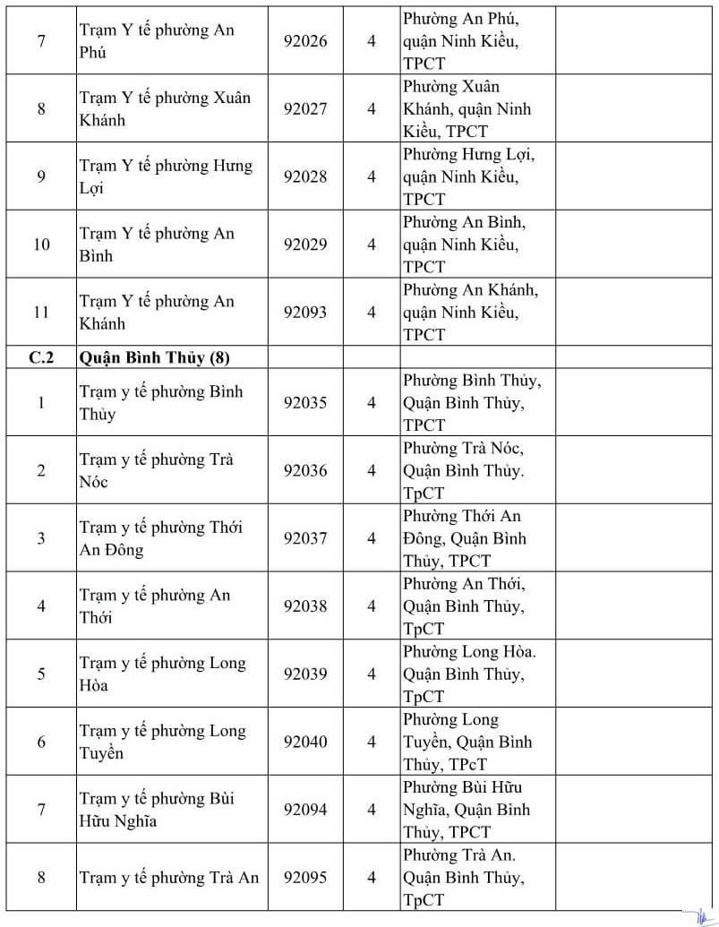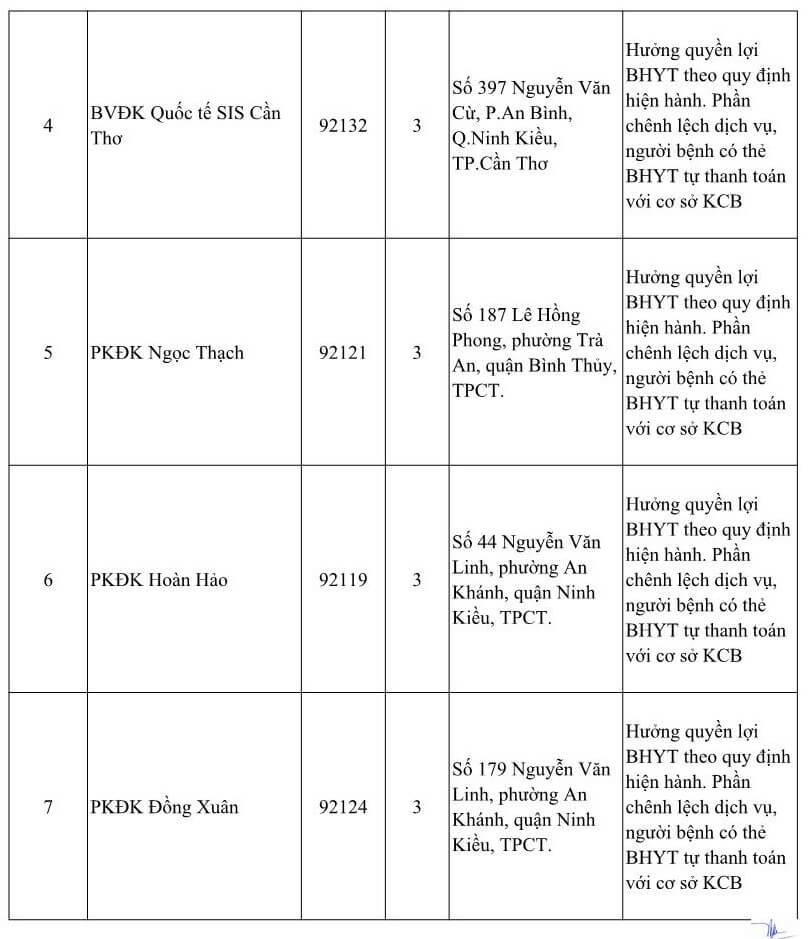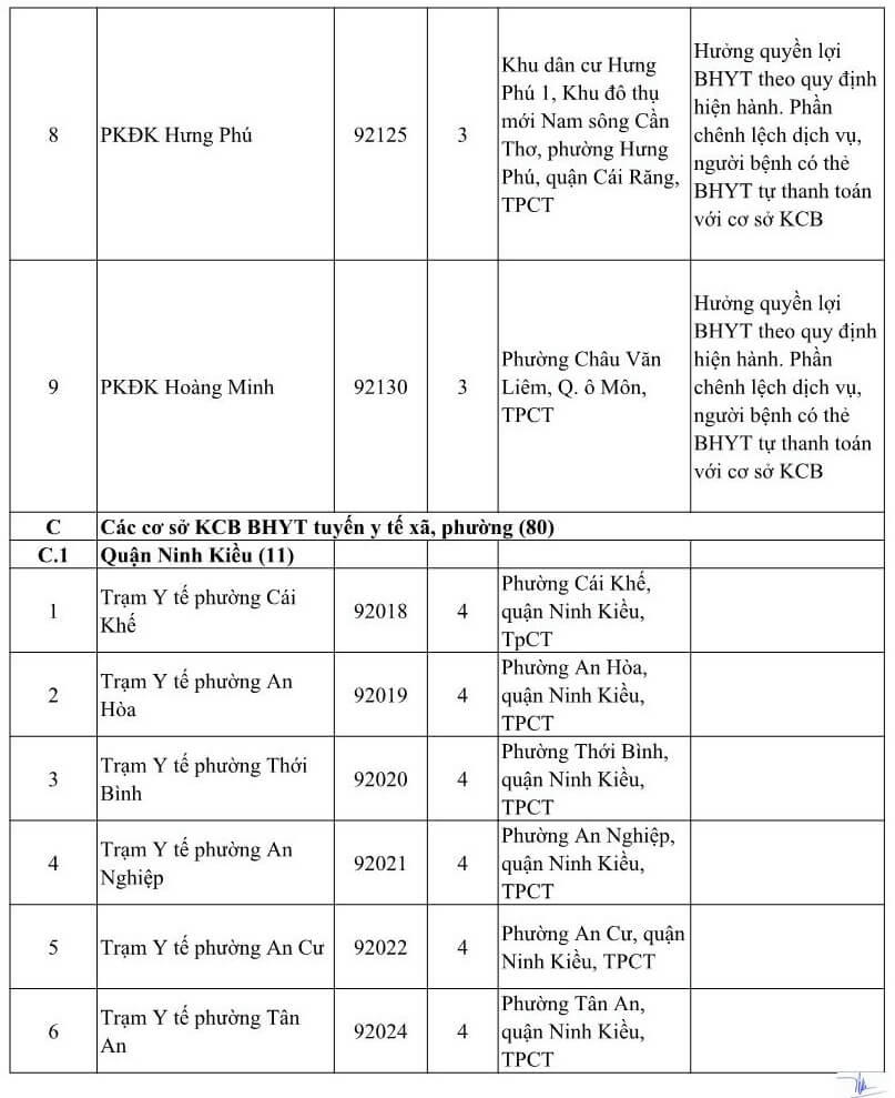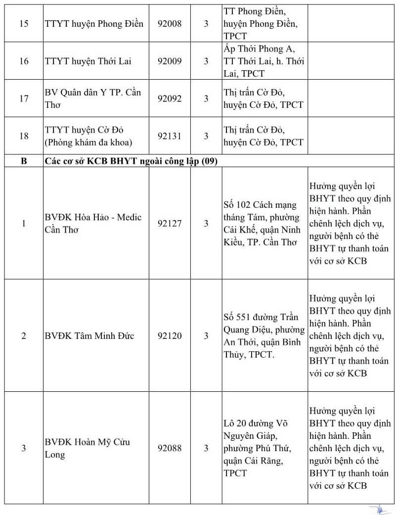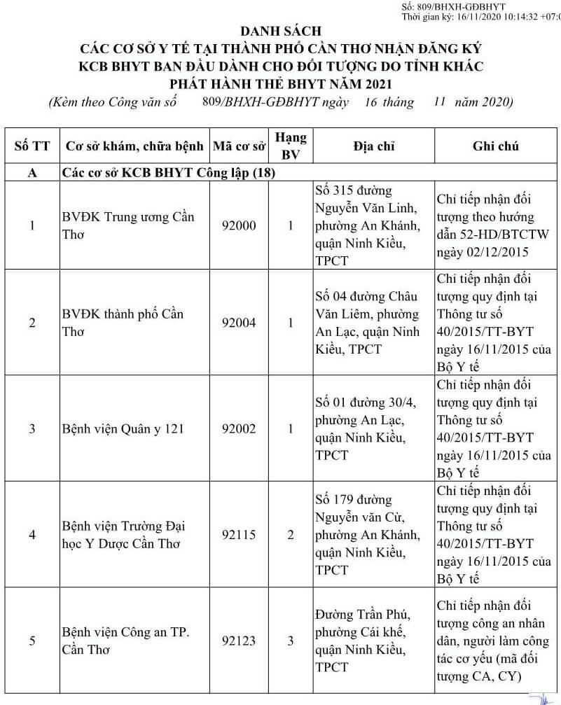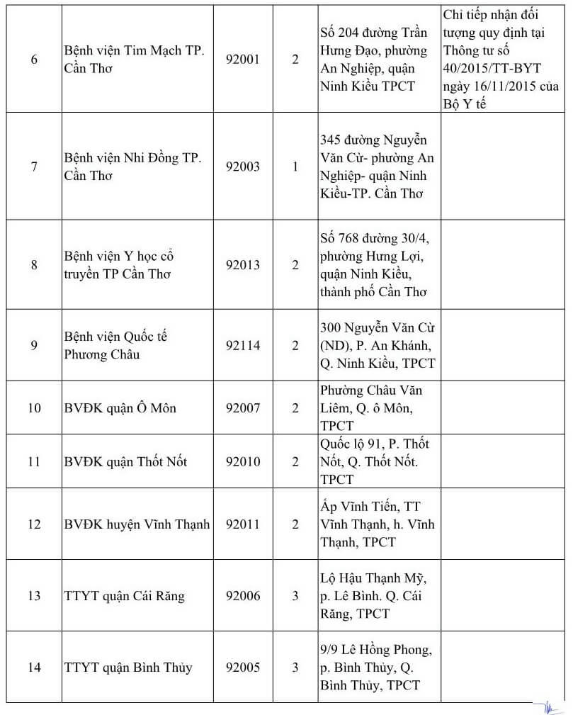 DANH SÁCH CÁC CƠ SỞ Y TẾ TẠI THÀNH PHỐ CẦN THƠ NHẬN ĐĂNG KÝ KCB BHYT BAN ĐẦU DÀNH CHO ĐỐI TƯỢNG DO TỈNH KHÁC PHÁT HÀNH THẺ BHYT NĂM 2021 (Kèm theo Công văn số 809/BHXH-GĐBHYT ngày 16 tháng 11 năm 2020)Số TT Cơ sở khám, chữa bệnh Mã cơ sở Hạng BV Địa chỉ Ghi chú A Các cơ sở KCB BHYT Công lập (18) 1 BVĐK Trung ương Cần Thơ 92-000 1 Số 315 đường Nguyễn Văn Linh, phường An Khánh, quận Ninh Kiều, TPCT Chỉ tiếp nhận đối tượng theo hướng dẫn 52-HD/BTCTW ngày 02/12/2015 2 BVĐK thành phố Cần Thơ 92-004 1 Số 04 đường Châu Văn Liêm, phường An Lạc, quận Ninh Kiều, TPCT Chỉ tiếp nhận đối tượng quy định tại Thông tư số 40/2015/TT-BYT ngày 16/11/2015 của Bộ Y tế 3 Bệnh viện Quân y 121 92-002 1 Số 01 đường 30/4, phường An Lạc, quận Ninh Kiều, TPCT Chỉ tiếp nhận đối tượng quy định tại Thông tư số 40/2015/TT-BYT ngày 16/11/2015 của Bộ Y tế 4 Bệnh viện Trường Đại học Y Dược Cần Thơ 92-115 2 Số 179 đường Nguyễn văn Cừ, phường An Khánh, quận Ninh Kiều, TPCT Chỉ tiếp nhận đối tượng quy định tại Thông tư số 40/2015/TT-BYT ngày 16/11/2015 của Bộ Y tế 5 Bệnh viện Công an TP. Cần Thơ 92-123 3 Đường Trần Phú, phường Cái khế, quận Ninh Kiều, TPCT Chỉ tiếp nhận đối tượng công an nhân dân, người làm công tác cơ yếu (mã đối tượng CA, CY) 6 Bệnh viện Tim Mạch TP. Cần Thơ 92-001 2 Số 204 đường Trần Hưng Đạo, phường An Nghiệp, quận Ninh Kiều TPCT Chỉ tiếp nhận đối tượng quy định tại Thông tư số 40/2015/TT-BYT ngày 16/11/2015 của Bộ Y tế 7 Bệnh viện Nhi Đồng TP. Cần Thơ 92-003 1 345 đường Nguyễn Văn Cừ- phường An Nghiệp- quận Ninh Kiều-TP. Cần Thơ 8 Bệnh viện Y học cổ truyền TP Cần Thơ 92-013 2 Số 768 đường 30/4, phường Hưng Lợi, quận Ninh Kiều, thành phố Cần Thơ 9 Bệnh viện Quốc tế Phương Châu 92-114 2 300 Nguyễn Văn Cừ (ND), P. An Khánh, Q. Ninh Kiều, TPCT 10 BVĐK quận Ô Môn 92-007 2 Phường Châu Văn Liêm, Q. ô Môn, TPCT 11 BVĐK quận Thốt Nốt 92-010 2 Quốc lộ 91, P. Thốt Nốt, Q. Thốt Nốt. TPCT 12 BVĐK huyện Vĩnh Thạnh 92-011 2 Ấp Vĩnh Tiến, TT Vĩnh Thạnh, h. Vĩnh Thạnh, TPCT 13 TTYT quận Cái Răng 92-006 3 Lộ Hậu Thạnh Mỹ, p. Lê Bình. Q. Cái Răng, TPCT 14 TTYT quận Bình Thủy 92-005 3 9/9 Lê Hồng Phong, p. Bình Thủy, Q. Bình Thủy, TPCT 15 TTYT huyện Phong Điền 92-008 3 TT Phong Điền, huyện Phong Điền, TPCT 16 TTYT huyện Thới Lai 92-009 3 Ấp Thới Phong A, TT Thới Lai, h. Thới Lai, TPCT 17 BV Quân dân Y TP. Cần Thơ 92-092 3 Thị trấn Cờ Đỏ, huyện Cờ Đỏ, TPCT 18 TTYT huyện Cờ Đỏ (Phòng khám đa khoa) 92-131 3 Thị trấn Cờ Đỏ, huyện Cờ Đỏ, TPCT B Các cơ sở KCB BHYT ngoài công lập (09) 1 BVĐK Hòa Hảo - Medic Cần Thơ 92-127 3 Số 102 Cách mạng tháng Tám, phường Cái Khế, quận Ninh Kiều, TP. Cần Thơ Hưởng quyền lợi BHYT theo quy định hiện hành. Phần chênh lệch dịch vụ, người bệnh có thẻ BHYT tự thanh toán với cơ sở KCB 2 BVĐK Tâm Minh Đức 92-120 3 Số 551 đường Trần Quang Diệu, phường An Thới, quận Bình Thủy, TPCT. Hưởng quyền lợi BHYT theo quy định hiện hành. Phần chênh lệch dịch vụ, người bệnh có thẻ BHYT tự thanh toán với cơ sở KCB 3 BVĐK Hoàn Mỹ Cửu Long 92-088 3 Lô 20 đường Võ Nguyên Giáp, phường Phú Thứ, quận Cái Răng, TPCT Hưởng quyền lợi BHYT theo quy định hiện hành. Phần chênh lệch dịch vụ, người bệnh có thẻ BHYT tự thanh toán với cơ sở KCB 4 BVĐK Quốc tế SIS Cần Thơ 92-132 3 Số 397 Nguyễn Văn Cừ, P.An Bình, Q.Ninh Kiều, TP.Cần Thơ Hưởng quyền lợi BHYT theo quy định hiện hành. Phần chênh lệch dịch vụ, người bệnh có thẻ BHYT tự thanh toán với cơ sở KCB 5 PKĐK Ngọc Thạch 92-121 3 Số 187 Lê Hồng Phong, phường Trà An, quận Bình Thủy, TPCT. Hưởng quyền lợi BHYT theo quy định hiện hành. Phần chênh lệch dịch vụ, người bệnh có thẻ BHYT tự thanh toán với cơ sở KCB 6 PKĐK Hoàn Hảo 92-119 3 Số 44 Nguyễn Văn Linh, phường An Khánh, quận Ninh Kiều, TPCT. Hưởng quyền lợi BHYT theo quy định hiện hành. Phần chênh lệch dịch vụ, người bệnh có thẻ BHYT tự thanh toán với cơ sở KCB 7 PKĐK Đồng Xuân 92-124 3 Số 179 Nguyễn Văn Linh, phường An Khánh, quận Ninh Kiều, TPCT. Hưởng quyền lợi BHYT theo quy định hiện hành. Phần chênh lệch dịch vụ, người bệnh có thẻ BHYT tự thanh toán với cơ sở KCB 8 PKĐK Hưng Phú 92-125 3 Khu dân cư Hưng Phú 1, Khu đô thụ mới Nam sông Cần Thơ, phường Hưng Phú, quận Cái Răng, TPCT Hưởng quyền lợi BHYT theo quy định hiện hành. Phần chênh lệch dịch vụ, người bệnh có thẻ BHYT tự thanh toán với cơ sở KCB 9 PKĐK Hoàng Minh 92-130 3 Phường Châu Văn Liêm, Q. ô Môn, TPCT Hưởng quyền lợi BHYT theo quy định hiện hành. Phần chênh lệch dịch vụ, người bệnh có thẻ BHYT tự thanh toán với cơ sở KCB C Các cơ sở KCB BHYT tuyến y tế xã, phường (80) C.1 Quận Ninh Kiều (11) 1 Trạm Y tế phường Cái Khế 92-018 4 Phường Cái Khế, quận Ninh Kiều, TpCT 2 Trạm Y tế phường An Hòa 92-019 4 Phường An Hòa, quận Ninh Kiều, TPCT 3 Trạm Y tế phường Thới Bình 92-020 4 Phường Thới Bình, quận Ninh Kiều, TPCT 4 Trạm Y tế phường An Nghiệp