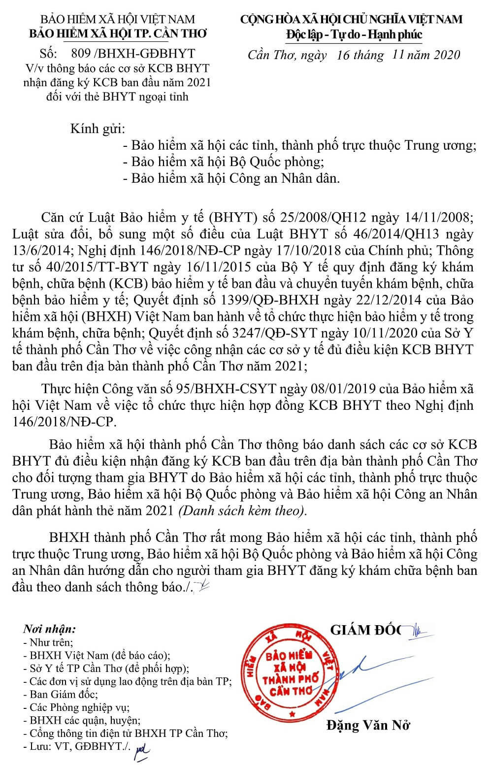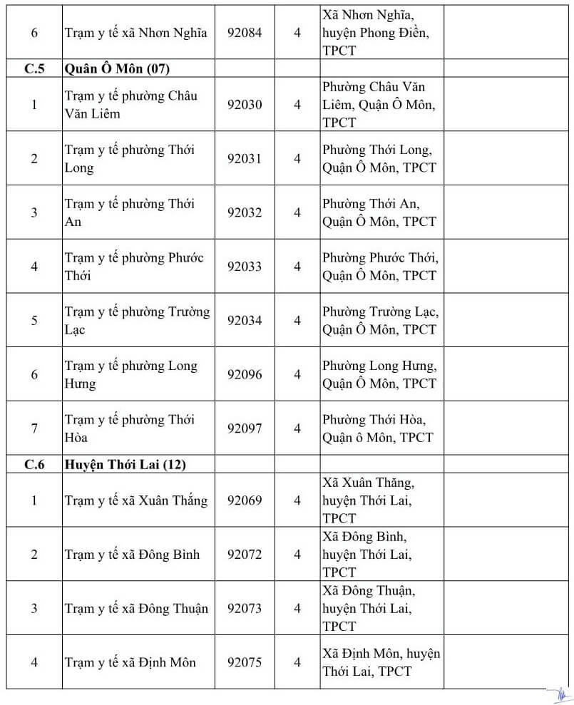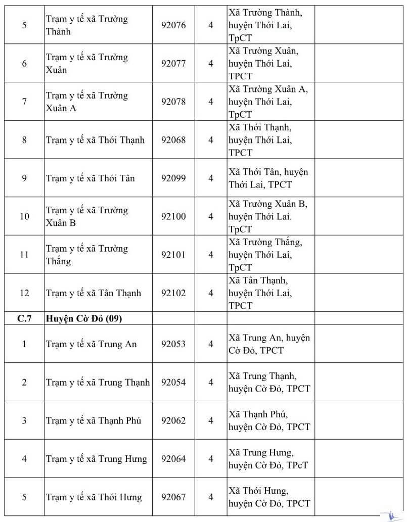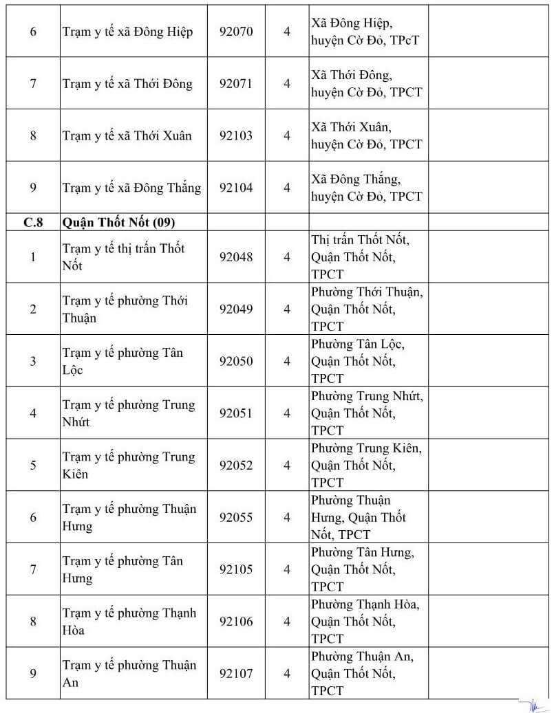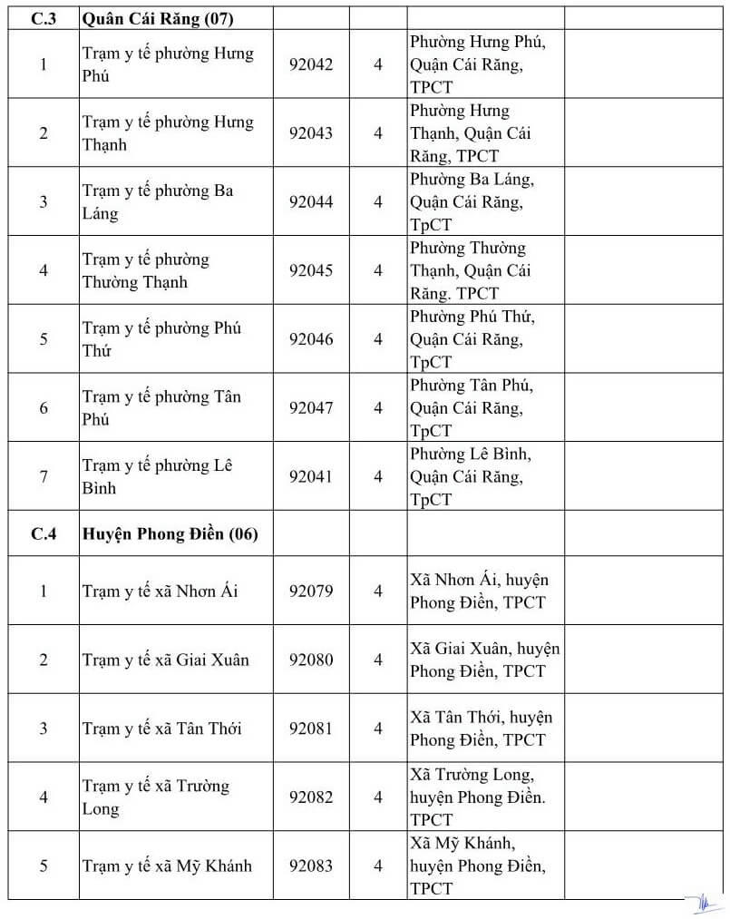 DANH SÁCH CÁC CƠ SỞ Y TẾ TẠI THÀNH PHỐ CẦN THƠ NHẬN ĐĂNG KÝ KCB BHYT BAN ĐẦU DÀNH CHO ĐỐI TƯỢNG DO TỈNH KHÁC PHÁT HÀNH THẺ BHYT NĂM 2021 (Kèm theo Công văn số 809/BHXH-GĐBHYT ngày 16 tháng 11 năm 2020)Số TT Cơ sở khám, chữa bệnh Mã cơ sở Hạng BV Địa chỉ Ghi chú A Các cơ sở KCB BHYT Công lập (18) 1 BVĐK Trung ương Cần Thơ 92-000 1 Số 315 đường Nguyễn Văn Linh, phường An Khánh, quận Ninh Kiều, TPCT Chỉ tiếp nhận đối tượng theo hướng dẫn 52-HD/BTCTW ngày 02/12/2015 2 BVĐK thành phố Cần Thơ 92-004 1 Số 04 đường Châu Văn Liêm, phường An Lạc, quận Ninh Kiều, TPCT Chỉ tiếp nhận đối tượng quy định tại Thông tư số 40/2015/TT-BYT ngày 16/11/2015 của Bộ Y tế 3 Bệnh viện Quân y 121 92-002 1 Số 01 đường 30/4, phường An Lạc, quận Ninh Kiều, TPCT Chỉ tiếp nhận đối tượng quy định tại Thông tư số 40/2015/TT-BYT ngày 16/11/2015 của Bộ Y tế 4 Bệnh viện Trường Đại học Y Dược Cần Thơ 92-115 2 Số 179 đường Nguyễn văn Cừ, phường An Khánh, quận Ninh Kiều, TPCT Chỉ tiếp nhận đối tượng quy định tại Thông tư số 40/2015/TT-BYT ngày 16/11/2015 của Bộ Y tế 5 Bệnh viện Công an TP. Cần Thơ 92-123 3 Đường Trần Phú, phường Cái khế, quận Ninh Kiều, TPCT Chỉ tiếp nhận đối tượng công an nhân dân, người làm công tác cơ yếu (mã đối tượng CA, CY) 6 Bệnh viện Tim Mạch TP. Cần Thơ 92-001 2 Số 204 đường Trần Hưng Đạo, phường An Nghiệp, quận Ninh Kiều TPCT Chỉ tiếp nhận đối tượng quy định tại Thông tư số 40/2015/TT-BYT ngày 16/11/2015 của Bộ Y tế 7 Bệnh viện Nhi Đồng TP. Cần Thơ 92-003 1 345 đường Nguyễn Văn Cừ- phường An Nghiệp- quận Ninh Kiều-TP. Cần Thơ 8 Bệnh viện Y học cổ truyền TP Cần Thơ 92-013 2 Số 768 đường 30/4, phường Hưng Lợi, quận Ninh Kiều, thành phố Cần Thơ 9 Bệnh viện Quốc tế Phương Châu 92-114 2 300 Nguyễn Văn Cừ (ND), P. An Khánh, Q. Ninh Kiều, TPCT 10 BVĐK quận Ô Môn 92-007 2 Phường Châu Văn Liêm, Q. ô Môn, TPCT 11 BVĐK quận Thốt Nốt 92-010 2 Quốc lộ 91, P. Thốt Nốt, Q. Thốt Nốt. TPCT 12 BVĐK huyện Vĩnh Thạnh 92-011 2 Ấp Vĩnh Tiến, TT Vĩnh Thạnh, h. Vĩnh Thạnh, TPCT 13 TTYT quận Cái Răng 92-006 3 Lộ Hậu Thạnh Mỹ, p. Lê Bình. Q. Cái Răng, TPCT 14 TTYT quận Bình Thủy 92-005 3 9/9 Lê Hồng Phong, p. Bình Thủy, Q. Bình Thủy, TPCT 15 TTYT huyện Phong Điền 92-008 3 TT Phong Điền, huyện Phong Điền, TPCT 16 TTYT huyện Thới Lai 92-009 3 Ấp Thới Phong A, TT Thới Lai, h. Thới Lai, TPCT 17 BV Quân dân Y TP. Cần Thơ 92-092 3 Thị trấn Cờ Đỏ, huyện Cờ Đỏ, TPCT 18 TTYT huyện Cờ Đỏ (Phòng khám đa khoa) 92-131 3 Thị trấn Cờ Đỏ, huyện Cờ Đỏ, TPCT B Các cơ sở KCB BHYT ngoài công lập (09) 1 BVĐK Hòa Hảo - Medic Cần Thơ 92-127 3 Số 102 Cách mạng tháng Tám, phường Cái Khế, quận Ninh Kiều, TP. Cần Thơ Hưởng quyền lợi BHYT theo quy định hiện hành. Phần chênh lệch dịch vụ, người bệnh có thẻ BHYT tự thanh toán với cơ sở KCB 2 BVĐK Tâm Minh Đức 92-120 3 Số 551 đường Trần Quang Diệu, phường An Thới, quận Bình Thủy, TPCT. Hưởng quyền lợi BHYT theo quy định hiện hành. Phần chênh lệch dịch vụ, người bệnh có thẻ BHYT tự thanh toán với cơ sở KCB 3 BVĐK Hoàn Mỹ Cửu Long 92-088 3 Lô 20 đường Võ Nguyên Giáp, phường Phú Thứ, quận Cái Răng, TPCT Hưởng quyền lợi BHYT theo quy định hiện hành. Phần chênh lệch dịch vụ, người bệnh có thẻ BHYT tự thanh toán với cơ sở KCB 4 BVĐK Quốc tế SIS Cần Thơ 92-132 3 Số 397 Nguyễn Văn Cừ, P.An Bình, Q.Ninh Kiều, TP.Cần Thơ Hưởng quyền lợi BHYT theo quy định hiện hành. Phần chênh lệch dịch vụ, người bệnh có thẻ BHYT tự thanh toán với cơ sở KCB 5 PKĐK Ngọc Thạch 92-121 3 Số 187 Lê Hồng Phong, phường Trà An, quận Bình Thủy, TPCT. Hưởng quyền lợi BHYT theo quy định hiện hành. Phần chênh lệch dịch vụ, người bệnh có thẻ BHYT tự thanh toán với cơ sở KCB 6 PKĐK Hoàn Hảo 92-119 3 Số 44 Nguyễn Văn Linh, phường An Khánh, quận Ninh Kiều, TPCT. Hưởng quyền lợi BHYT theo quy định hiện hành. Phần chênh lệch dịch vụ, người bệnh có thẻ BHYT tự thanh toán với cơ sở KCB 7 PKĐK Đồng Xuân 92-124 3 Số 179 Nguyễn Văn Linh, phường An Khánh, quận Ninh Kiều, TPCT. Hưởng quyền lợi BHYT theo quy định hiện hành. Phần chênh lệch dịch vụ, người bệnh có thẻ BHYT tự thanh toán với cơ sở KCB 8 PKĐK Hưng Phú 92-125 3 Khu dân cư Hưng Phú 1, Khu đô thụ mới Nam sông Cần Thơ, phường Hưng Phú, quận Cái Răng, TPCT Hưởng quyền lợi BHYT theo quy định hiện hành. Phần chênh lệch dịch vụ, người bệnh có thẻ BHYT tự thanh toán với cơ sở KCB 9 PKĐK Hoàng Minh 92-130 3 Phường Châu Văn Liêm, Q. ô Môn, TPCT Hưởng quyền lợi BHYT theo quy định hiện hành. Phần chênh lệch dịch vụ, người bệnh có thẻ BHYT tự thanh toán với cơ sở KCB C Các cơ sở KCB BHYT tuyến y tế xã, phường (80) C.1 Quận Ninh Kiều (11) 1 Trạm Y tế phường Cái Khế 92-018 4 Phường Cái Khế, quận Ninh Kiều, TpCT 2 Trạm Y tế phường An Hòa 92-019 4 Phường An Hòa, quận Ninh Kiều, TPCT 3 Trạm Y tế phường Thới Bình 92-020 4 Phường Thới Bình, quận Ninh Kiều, TPCT 4 Trạm Y tế phường An Nghiệp
