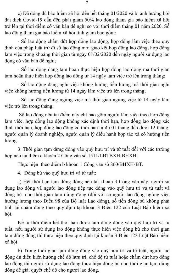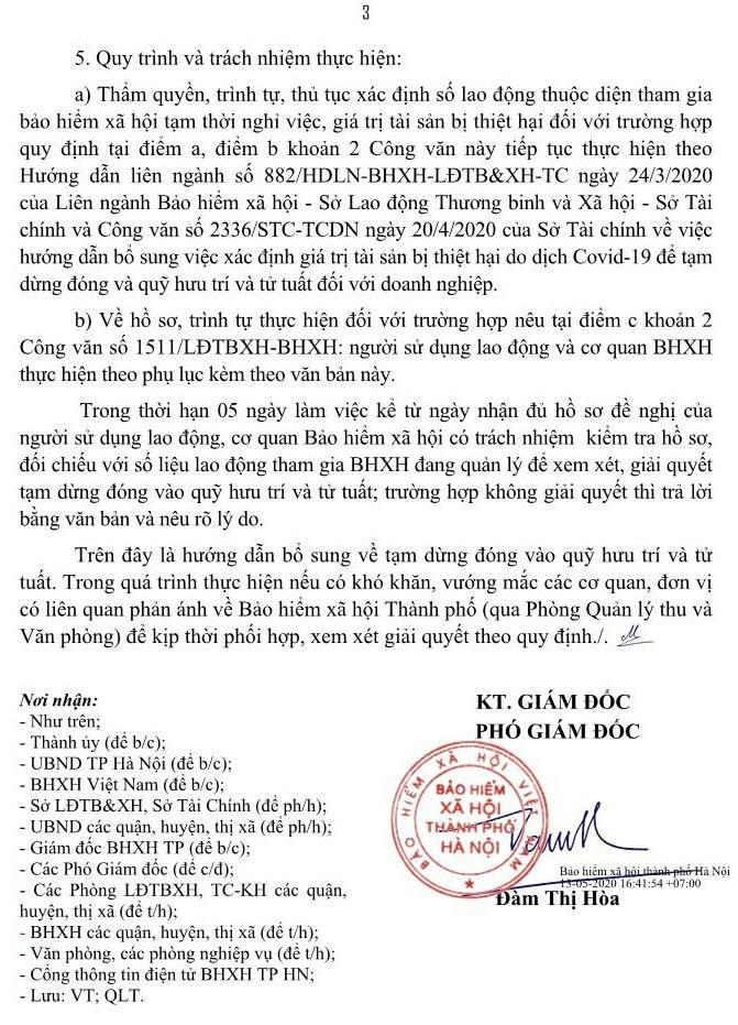 a) Thẩm quyền, trình tự, thủ tục xác định số lao động thuộc diện tham gia bảo hiểm xã hội tạm thời nghỉ việc, giá trị tài sản bị thiệt hại đối với trường hợp quy định tại điểm a, điểm b khoản 2 Công văn này tiếp tục thực hiện theo Hướng dẫn liên ngành số 882/HDLN-BHXH-LĐTB&XH-TC ngày 24/3/2020 của Liên ngành Bảo hiểm xã hội - Sở Lao động Thương binh và Xã hội - Sở Tài chính và Công văn số 2336/STC-TCDN ngày 20/4/2020 của Sở Tài chính về việc hướng dẫn bổ sung việc xác định giá trị tài sản bị thiệt hại do dịch Covid-19 để tạm dừng đóng và quỹ hưu trí và tử tuất đối với doanh nghiệp.