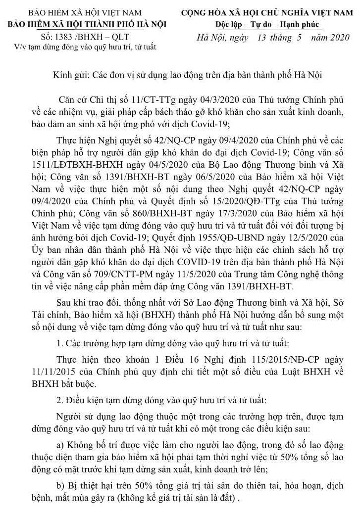 Nội dung Công văn số 1383/BHXH-QLT của Bảo hiểm xã hội (BHXH) thành phố Hà Nội hướng dẫn bổ sung một số nội dung về việc tạm dừng đóng vào quỹ hưu trí và tử tuất như sau: